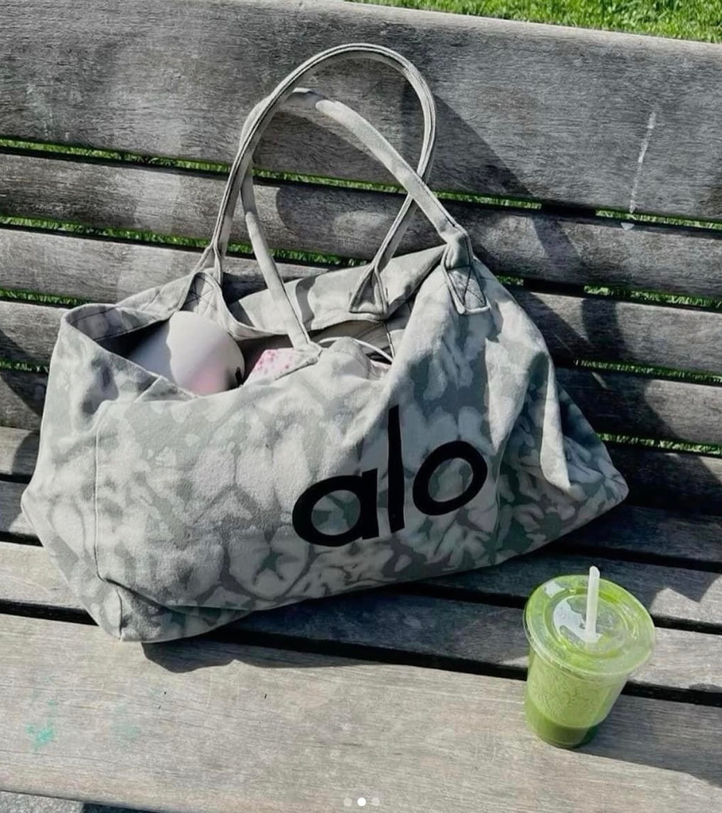 Lleva todo con estilo con el Tie Dye Shopper. Este bolso de lona resistente y de gran tamaño cuenta con asas de cuerda, el logotipo de Alo Yoga y un hermoso estampado de teñido anudado en tonos grises.