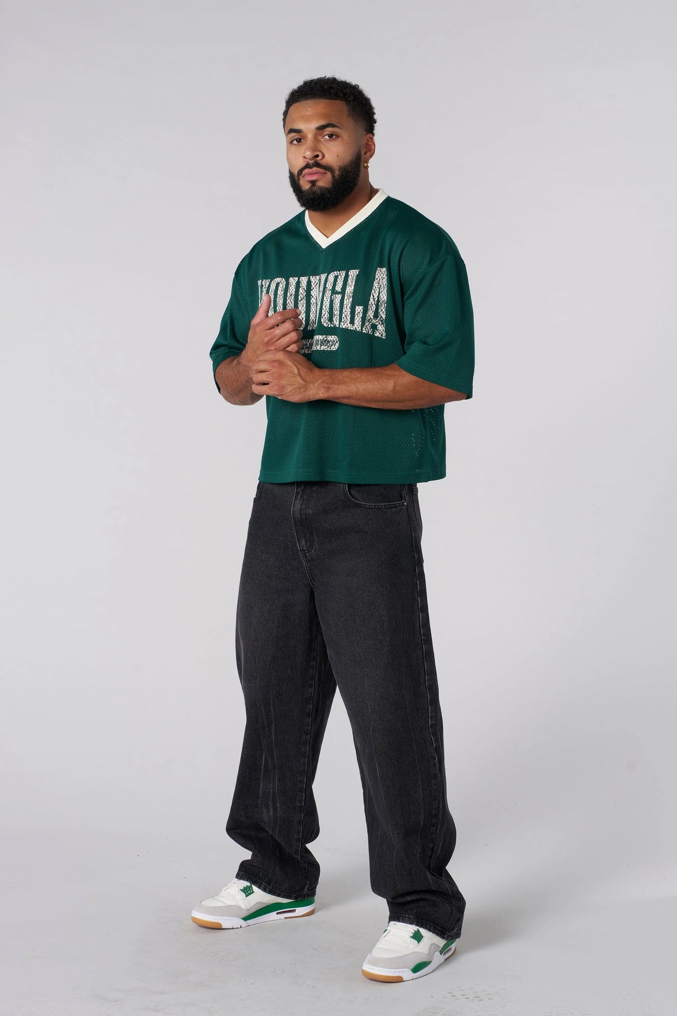 DISEÑO: Presentamos la Varsity Jersey, una camiseta de fútbol recortada confeccionada en malla de poliéster 100%. Cuenta con un cuello en V acanalado y un logotipo desgastado de YoungLA impreso en el pecho, esta camiseta ofrece un ambiente vintage con un toque moderno. Perfecta para un look deportivo y elegante que destaca.