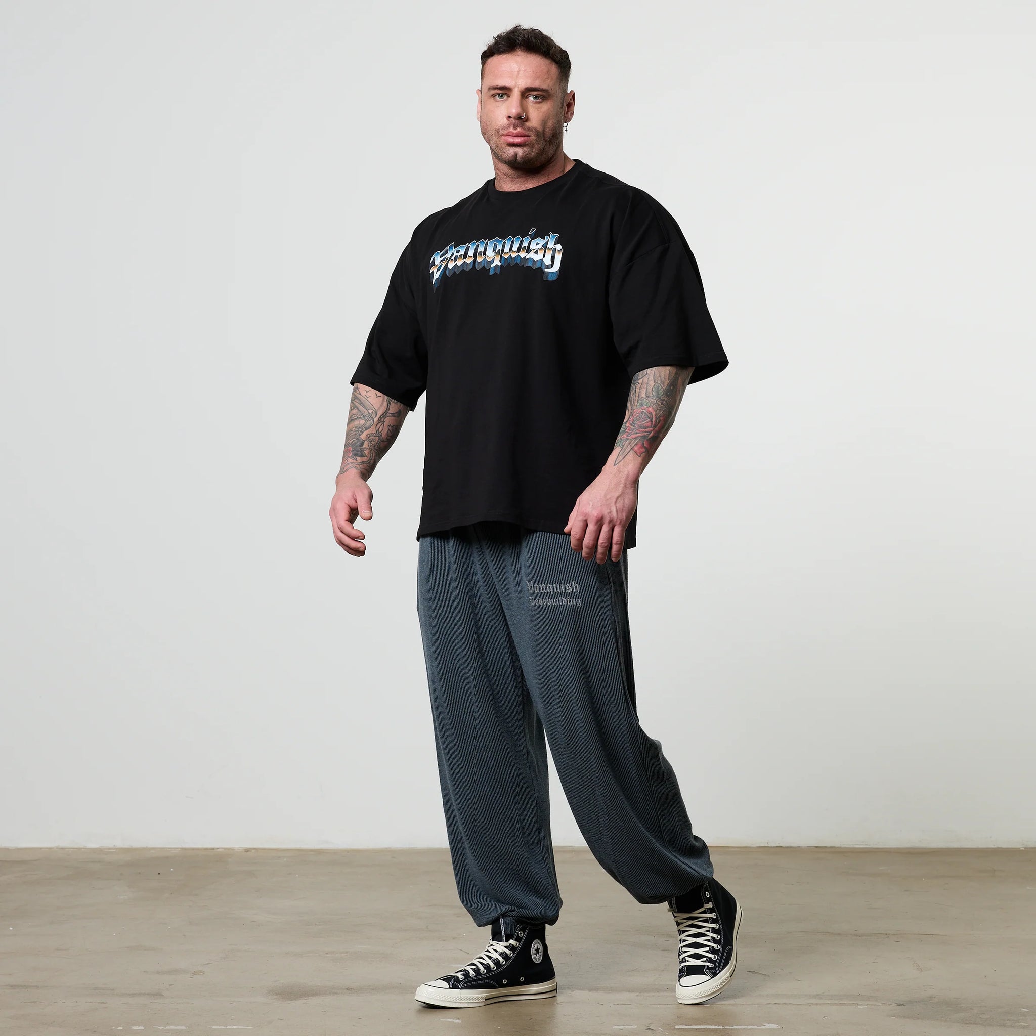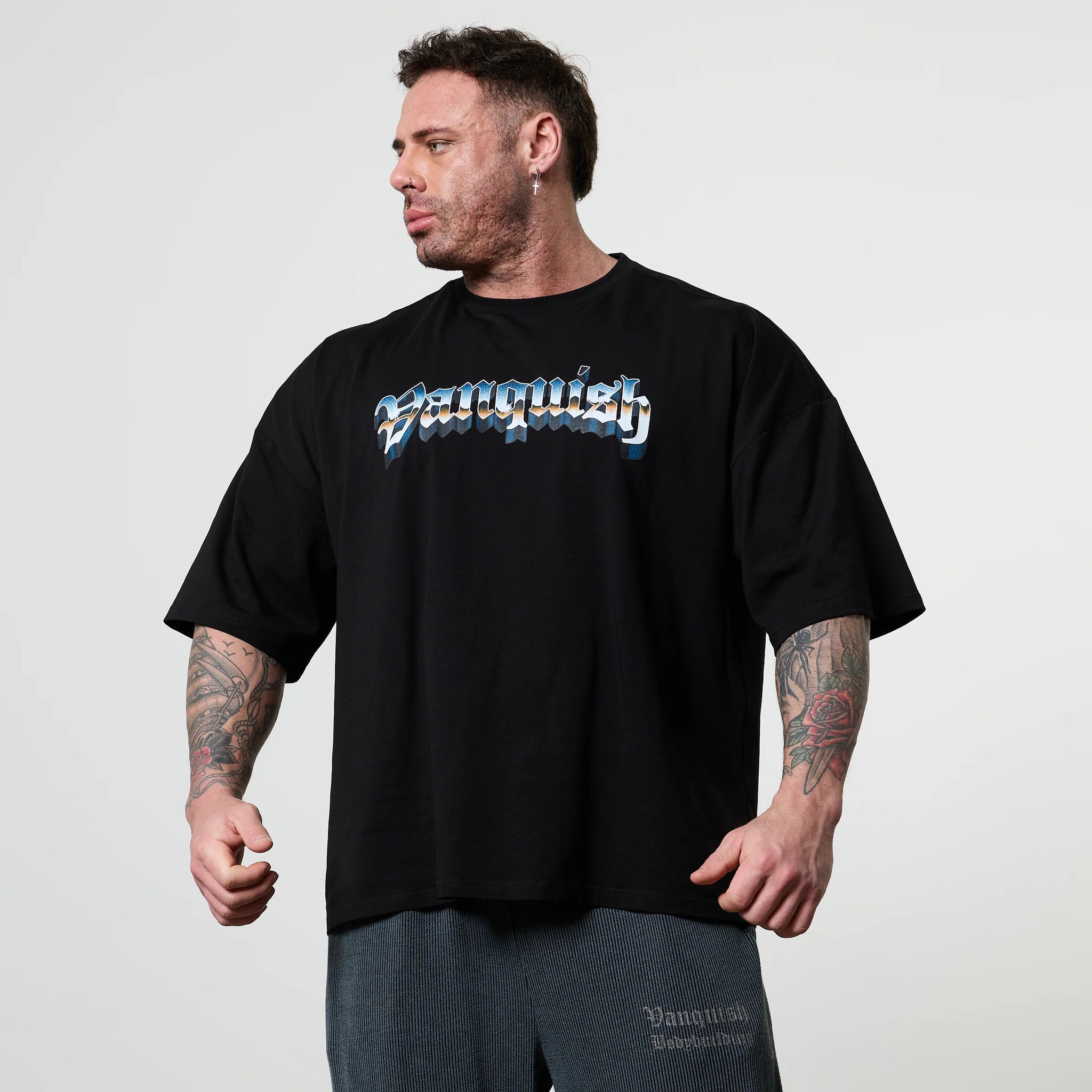 Esta Poseidon T-shirt de ajuste oversized presenta un cuello acanalado profundo, mangas caídas y costuras delanteras en los hombros para un estilo relajado y contemporáneo. Su diseño destaca un impresionante gráfico del dios mitológico del mar, Poseidón, complementado con el logo Vanquish en la parte frontal.