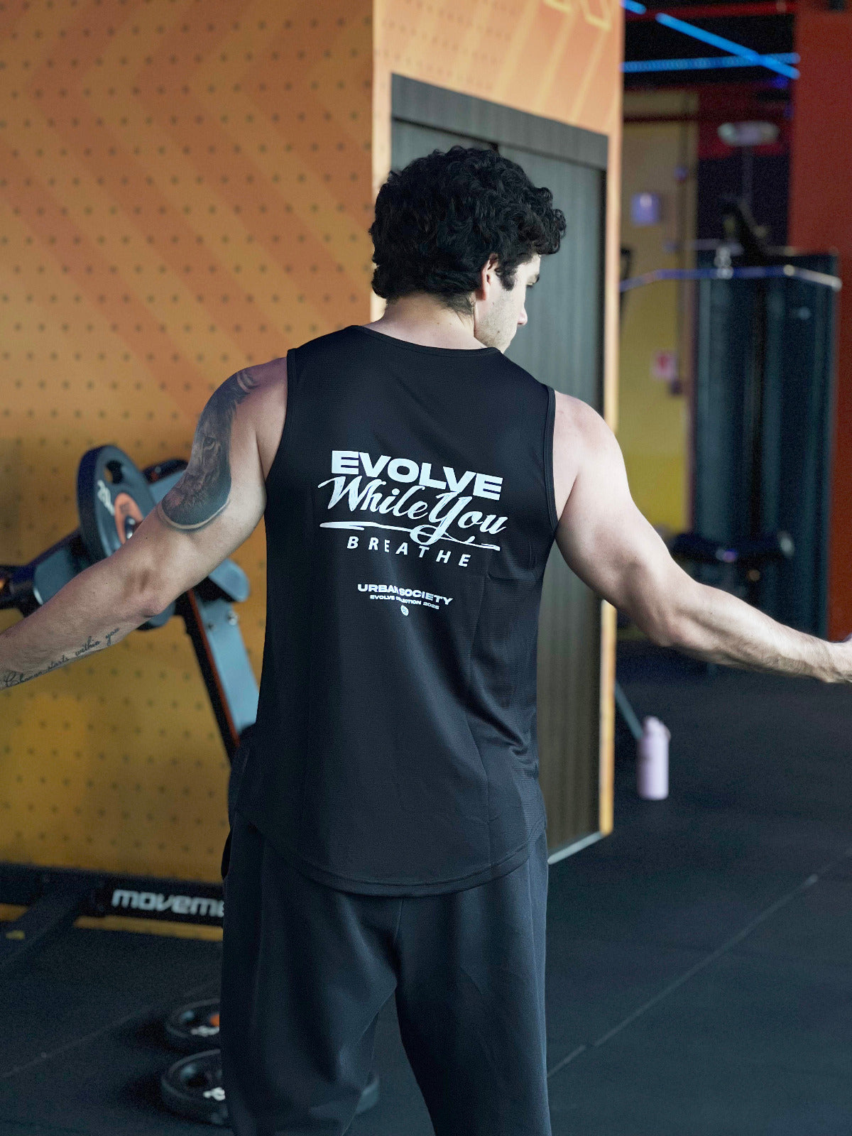 Confeccionada en tela ligera, suave y de secado rápido, permite libertad total de movimiento dentro y fuera del gimnasio. El frente presenta el logo Urban Society – Evolve Collection 2025 junto al símbolo de la serpiente, mientras que la parte posterior lleva el mensaje “Evolve While You Breathe”, reflejando la filosofía de transformación constante que define a la marca.